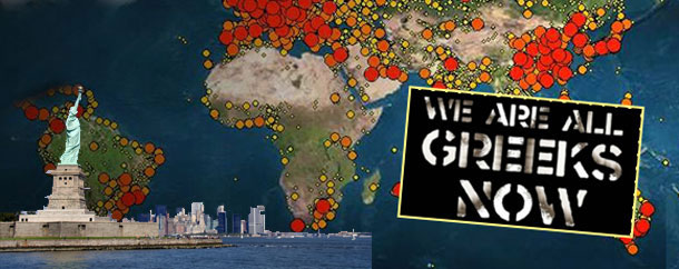 Παντού,σε όλη την οικουμένη διαδίδεται με ταχύτητα πυρκαγιάς το σύνθημα "We are all Greeks!" (Είμαστε όλοι Έλληνες).Ένα σύνθημα που πέρα απο την διεθνή εκδήλωση αλληλεγύης στην Ελλάδα,πυροδότησε και το φυτίλι μιας οικουμενικής αμφισβήτησης των βασικών ιδεολογικών πυλώνων της "Νέας Εποχής".